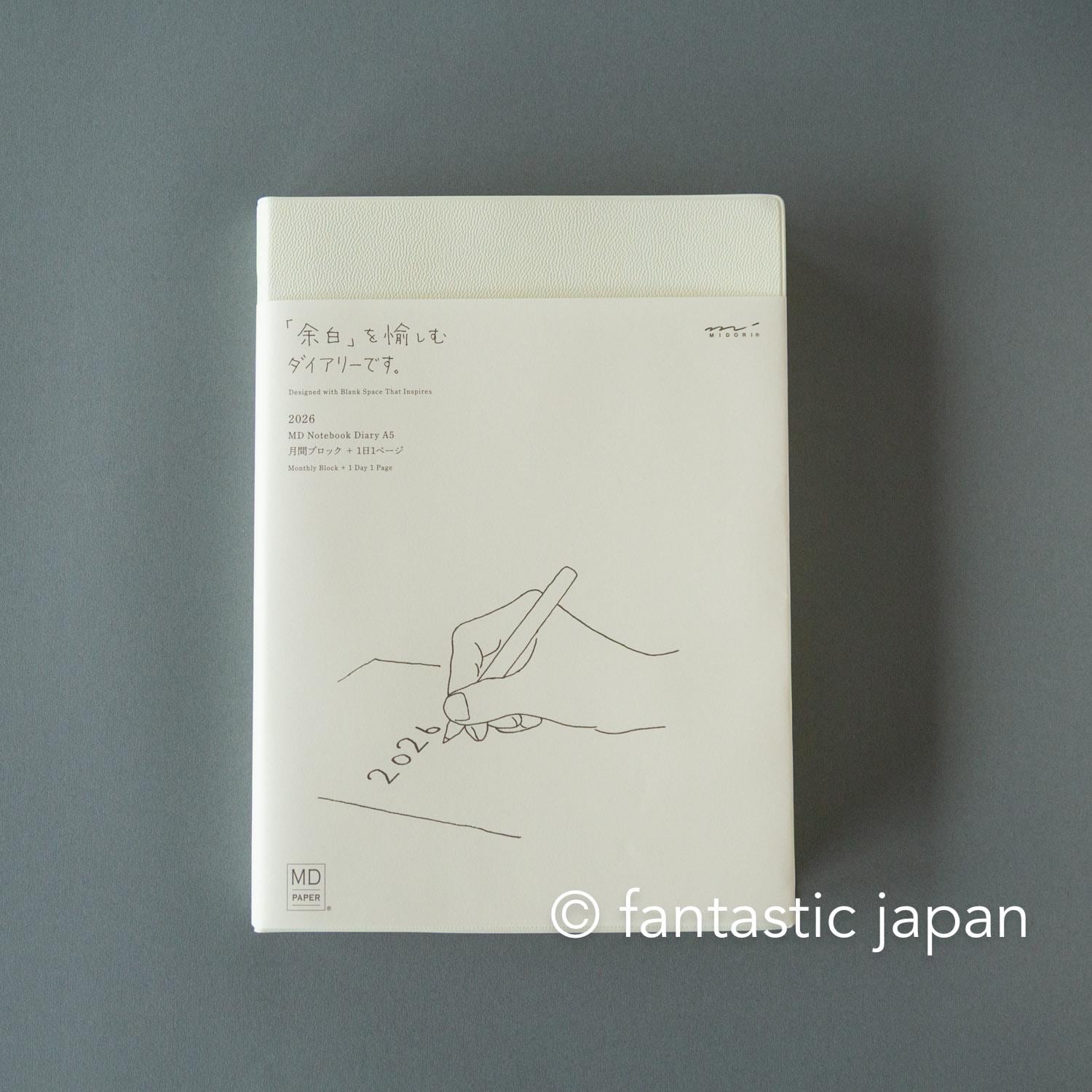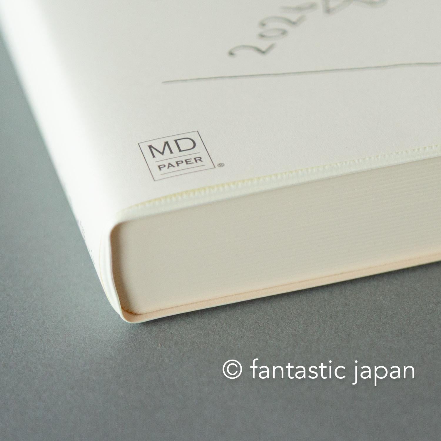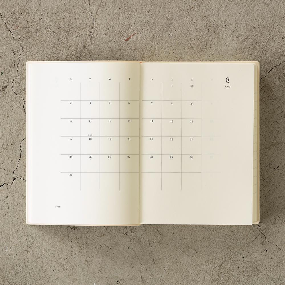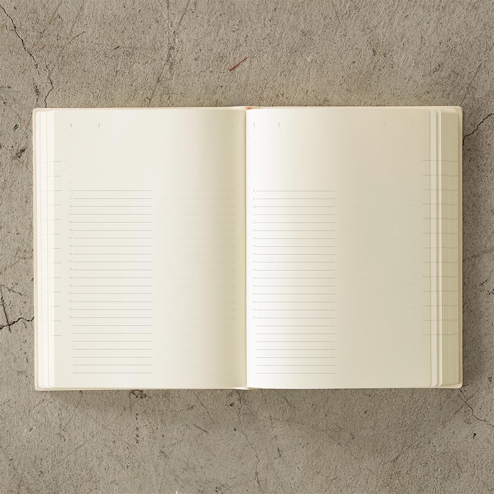 This diary features the same monthly schedule pages as the “MD Notebook Diary” and includes 385 free pages for daily use. The free pages provide space not only for time schedules but also for diaries, drawings, or notes. With generous margins, you can freely record your daily thoughts and events. The spine is embossed with the year, and a set of index stickers numbered 1–12 is included for easy monthly organization. Like a dictionary, this diary offers plenty of room to store your memories and records throughout the year.