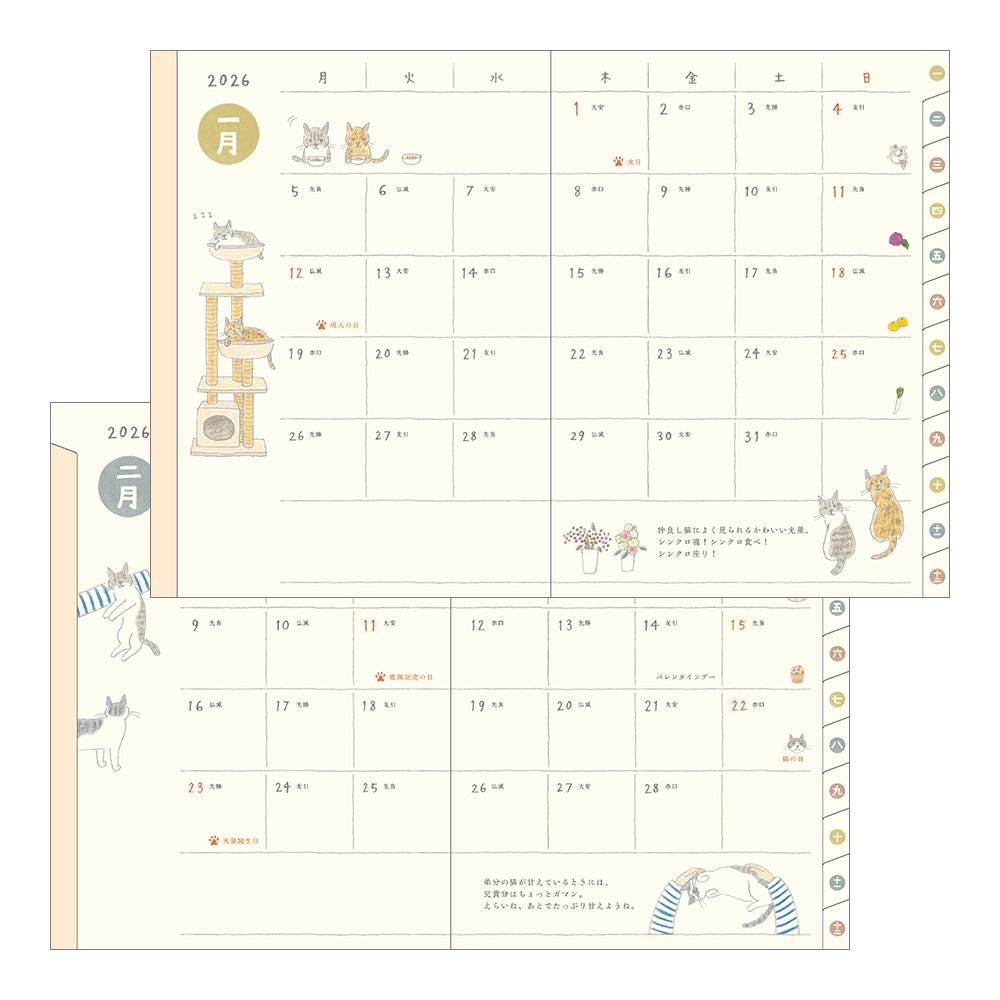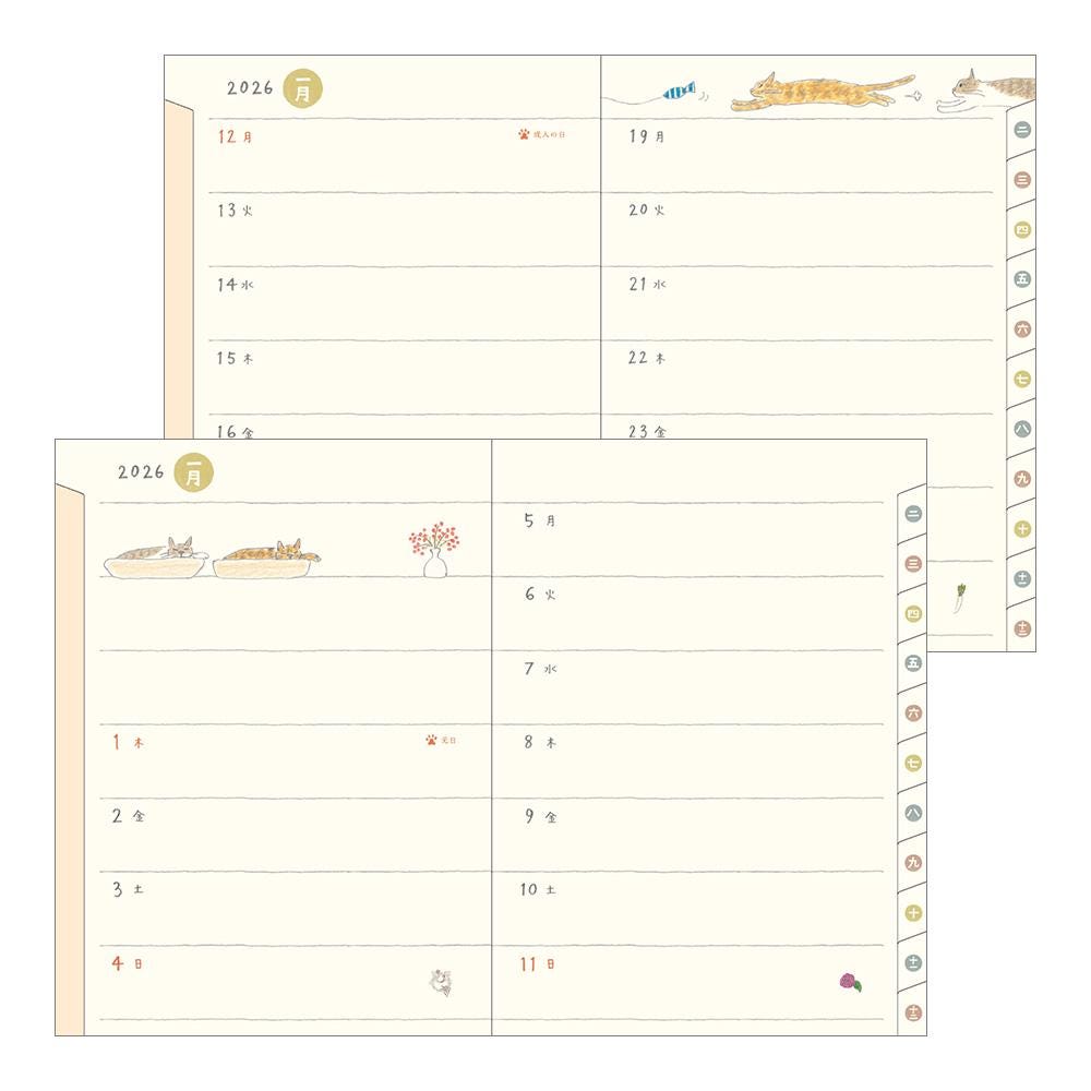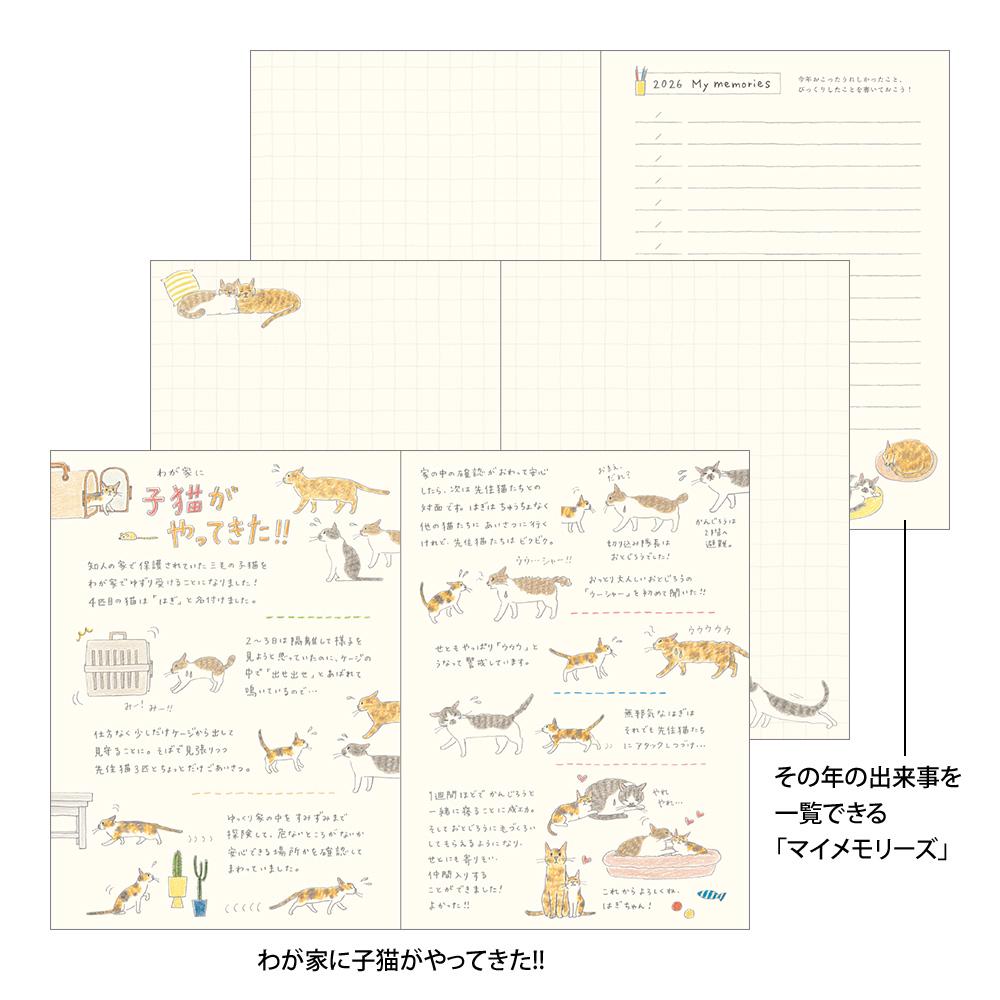 This 2026 edition features illustrations and columns by illustrator Sayo Koizumi, known for her soft and gentle cat drawings. The theme, “The Cats from the Koizumi Family,” captures the daily lives of the four unique cats living in Koizumi’s home. A special column at the end, “A Kitten Has Arrived!”, introduces a new kitten that joined the family during the making of this diary.