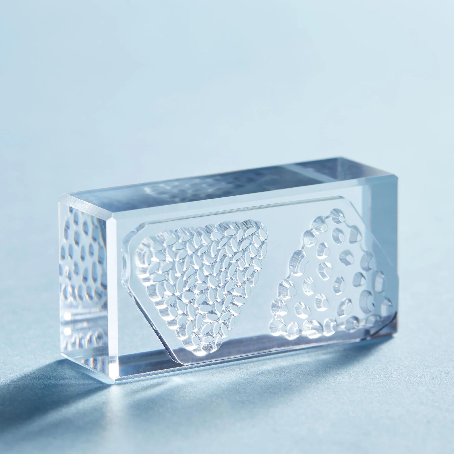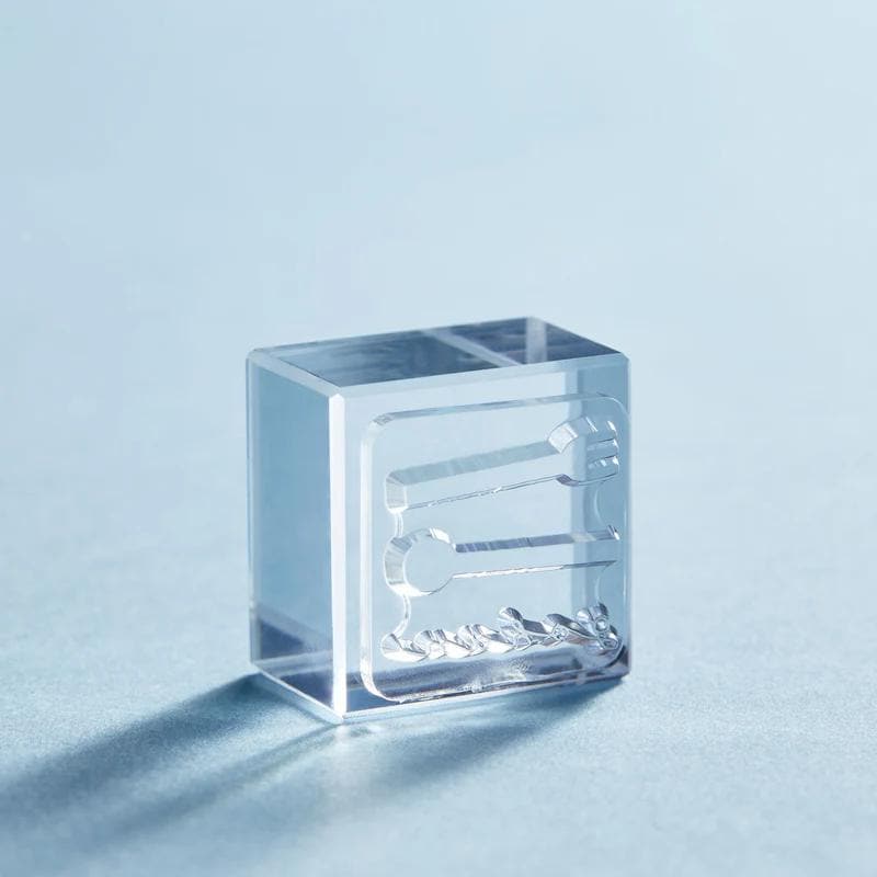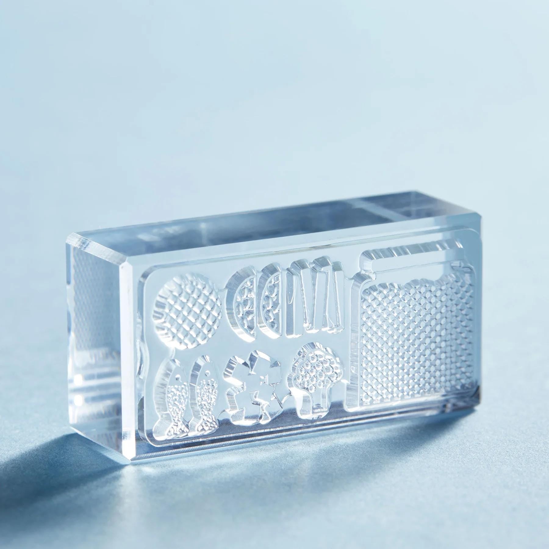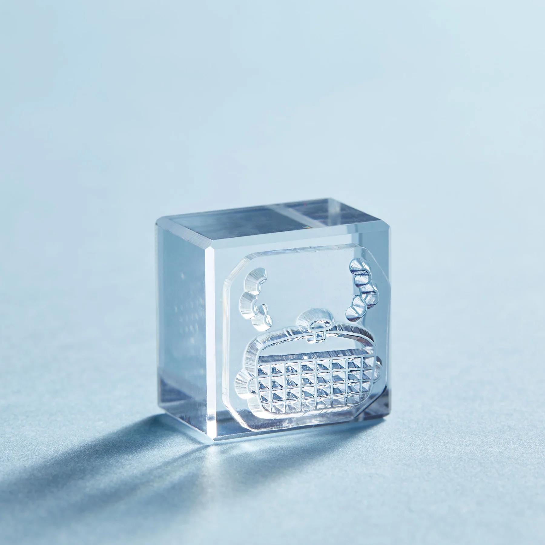 This clear stamp looks like an ice cube, with all parts made of transparent material.