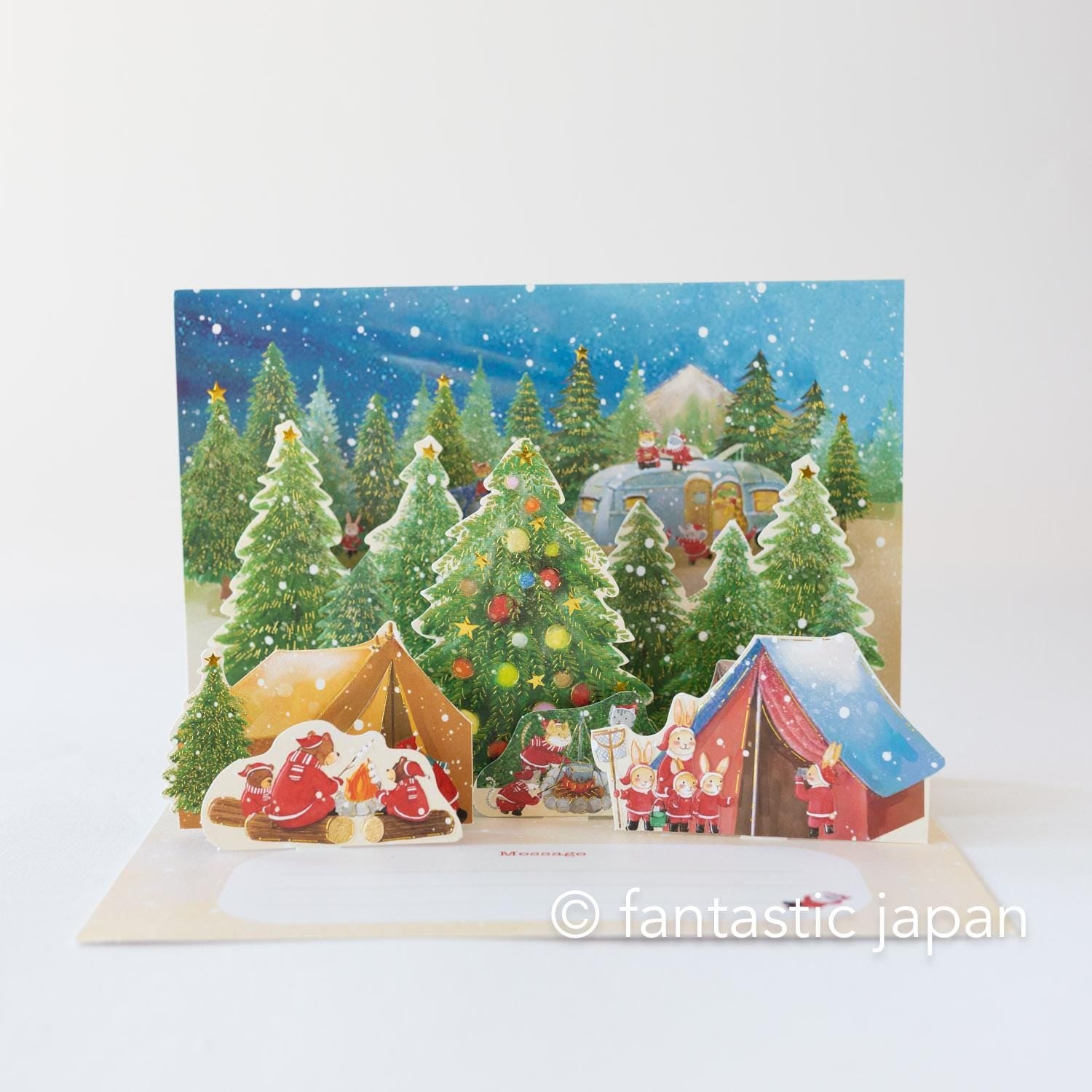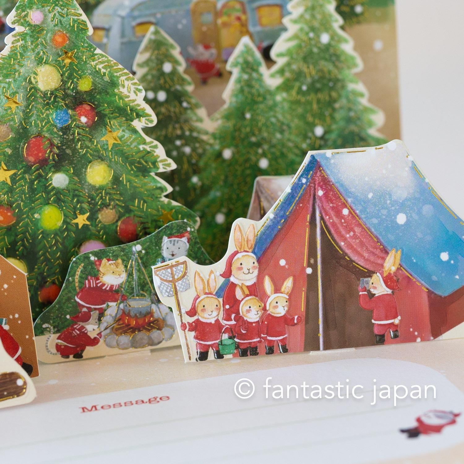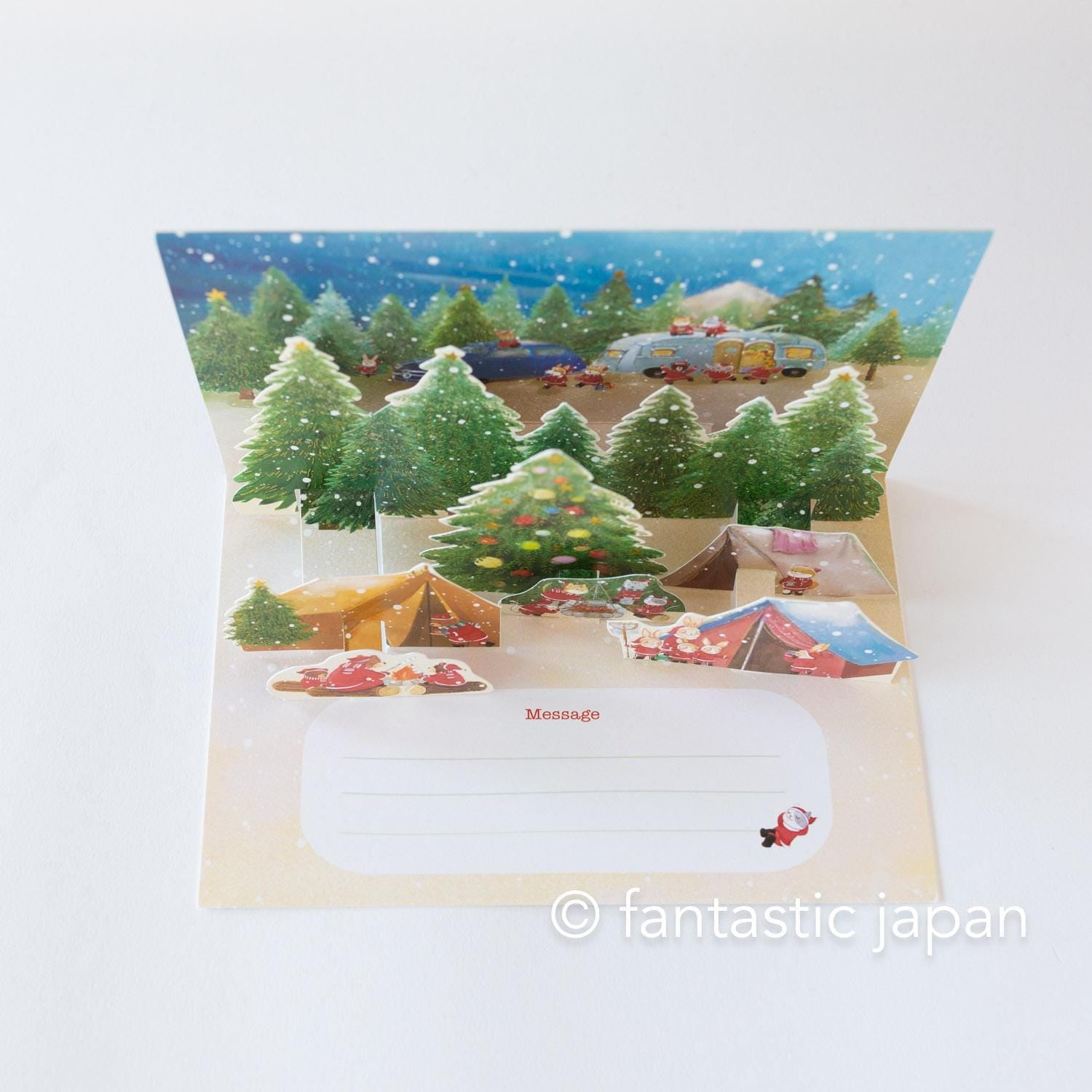 3D pop-up card featuring many Santa Clauses getting together and happily preparing for the holidays.
