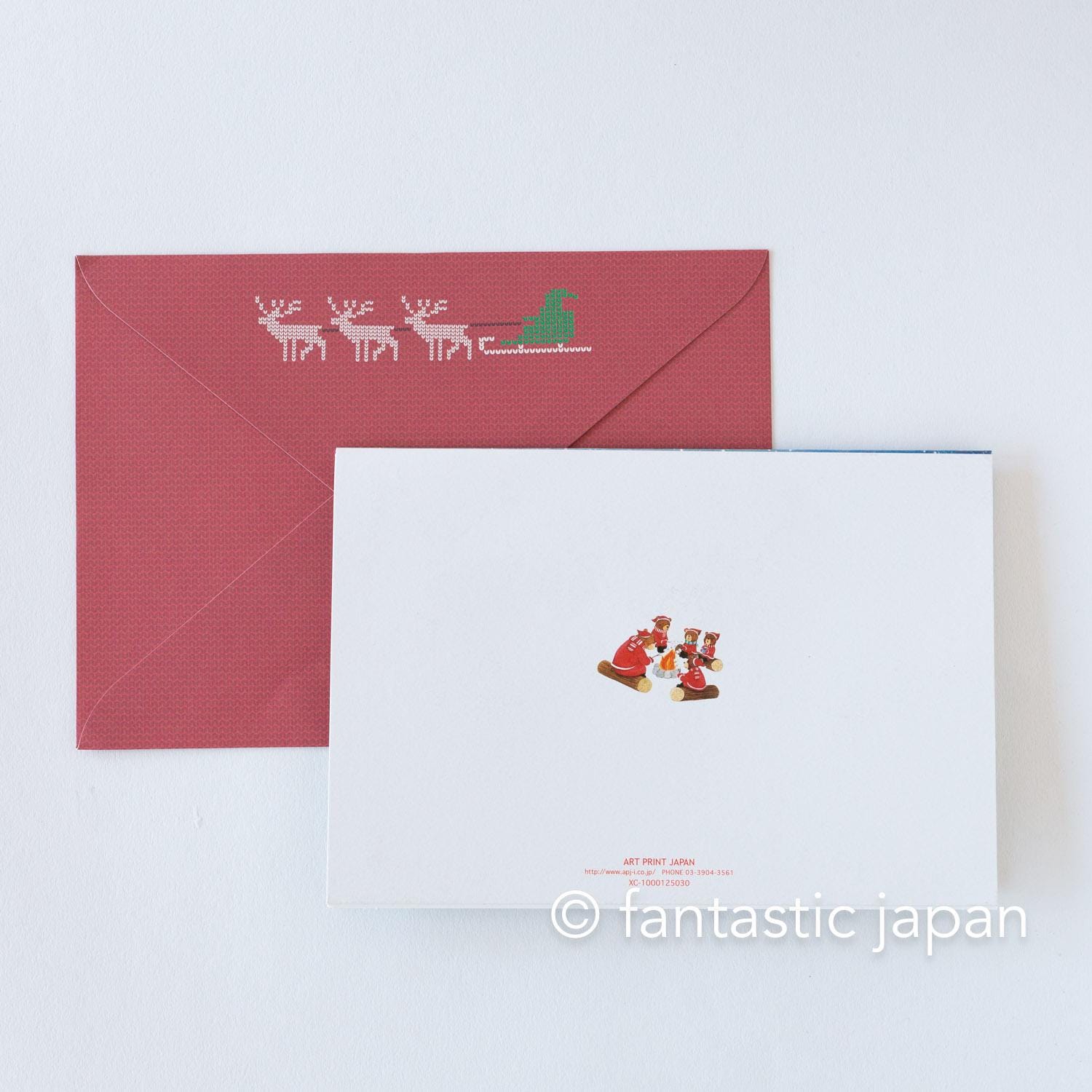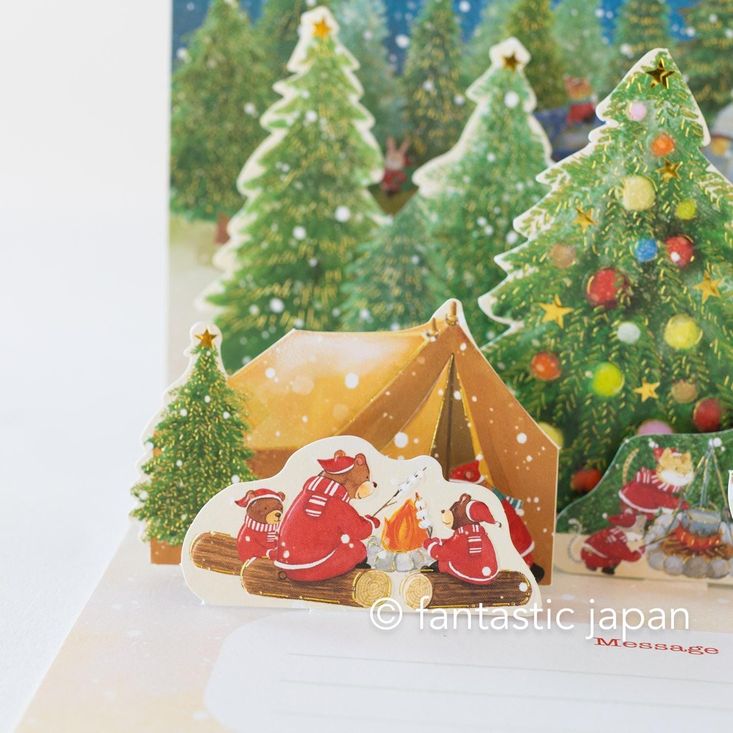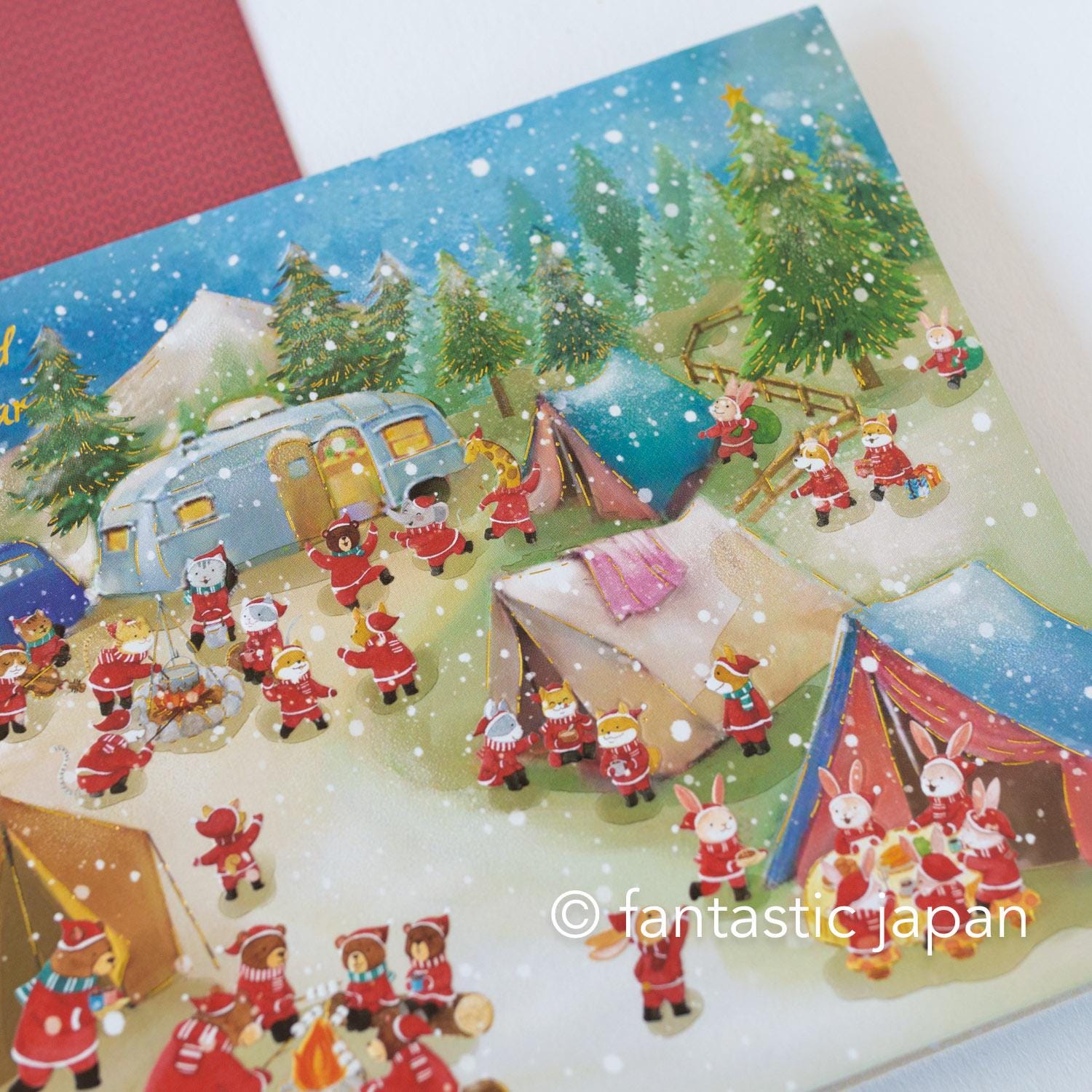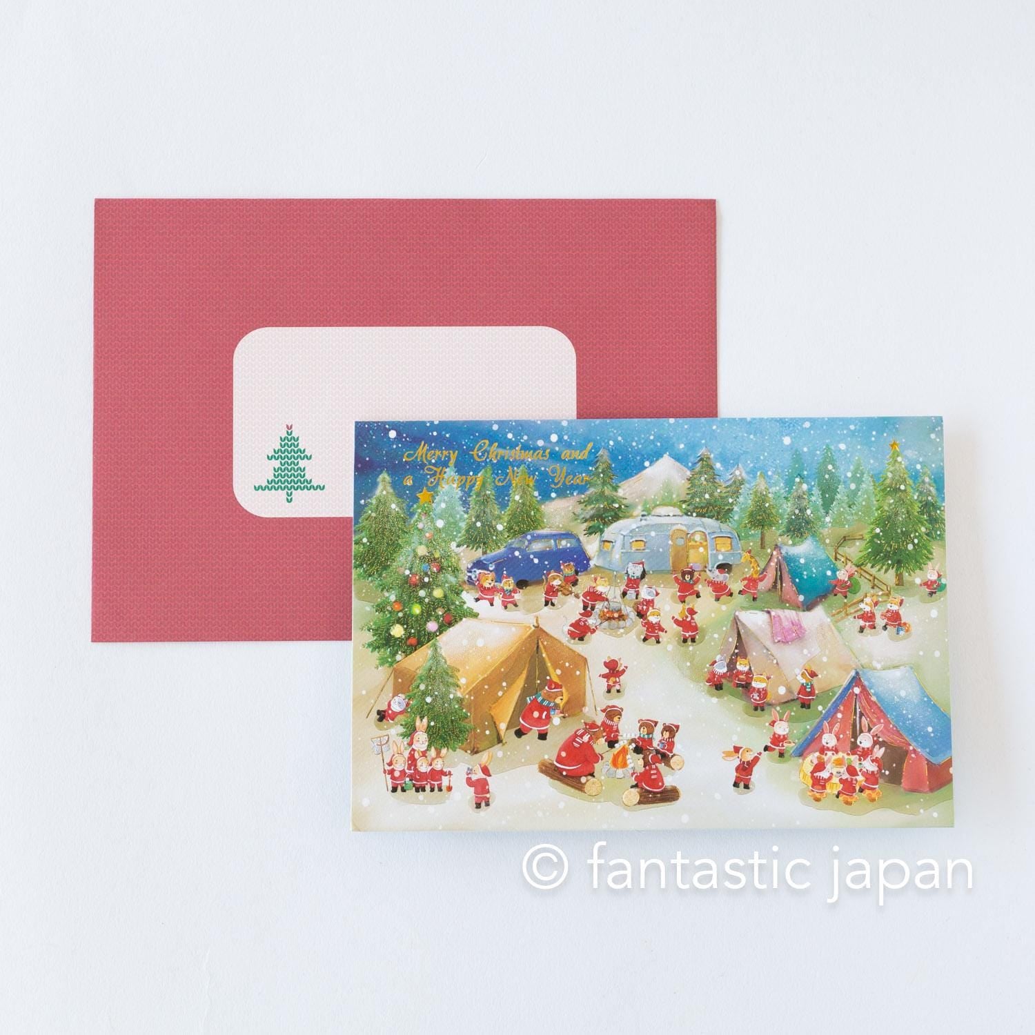 3D pop-up card featuring many Santa Clauses getting together and happily preparing for the holidays.