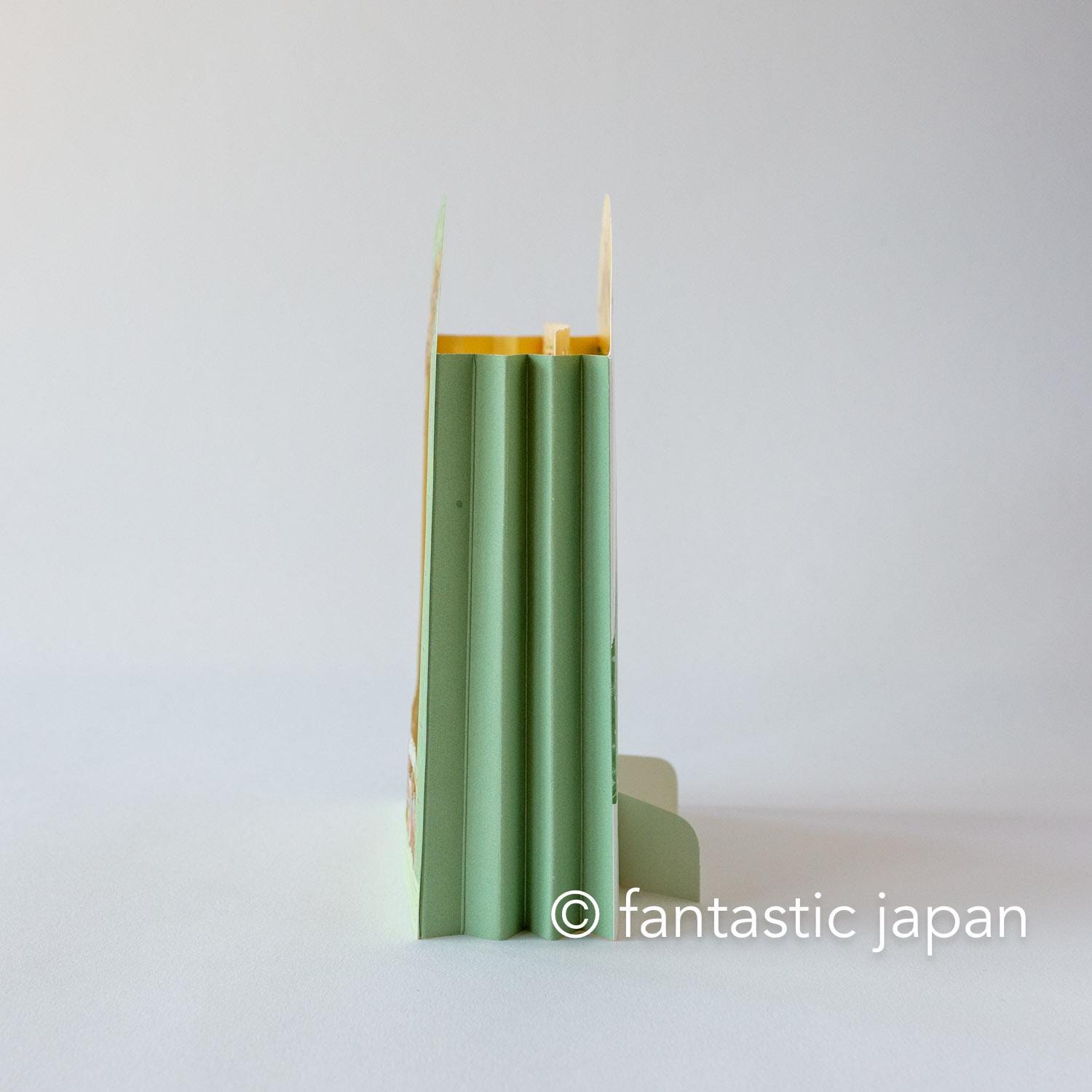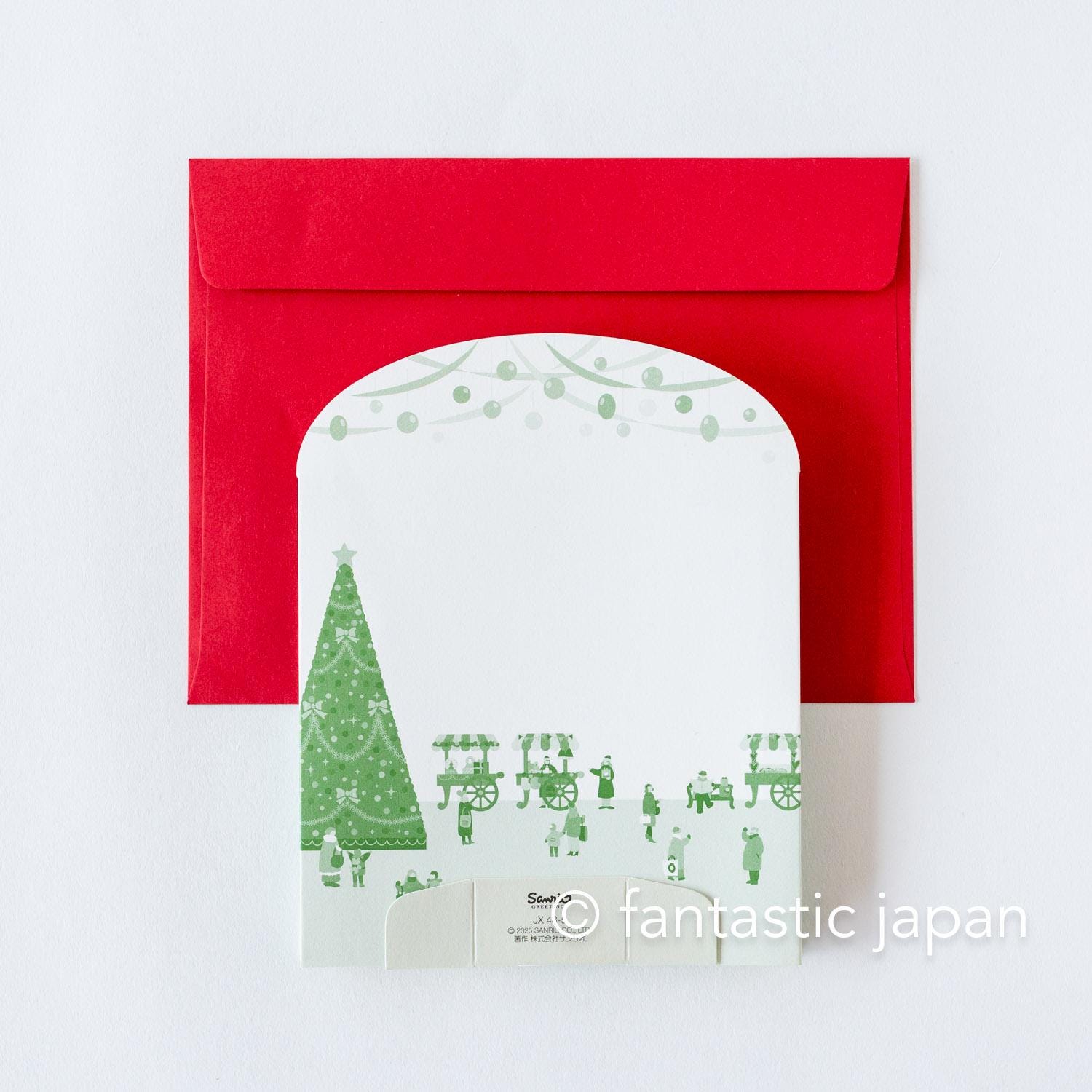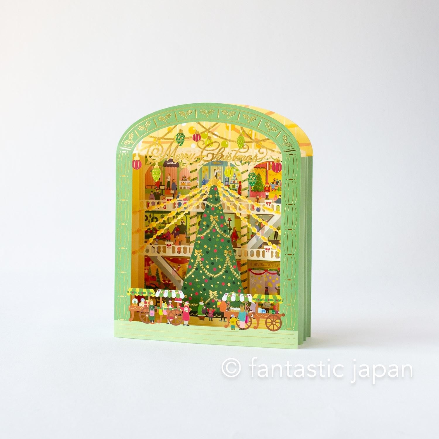 A three-dimensional greeting card featuring a beautifully detailed laser-cut design of a Christmas department store bustling with shoppers. Enjoy the festive decorations, Christmas tree, and charming store interiors. Gold foil accents on the first layer and the Christmas tree on the second layer; can be displayed standing as holiday décor; message space on the back; comes with a red envelope.