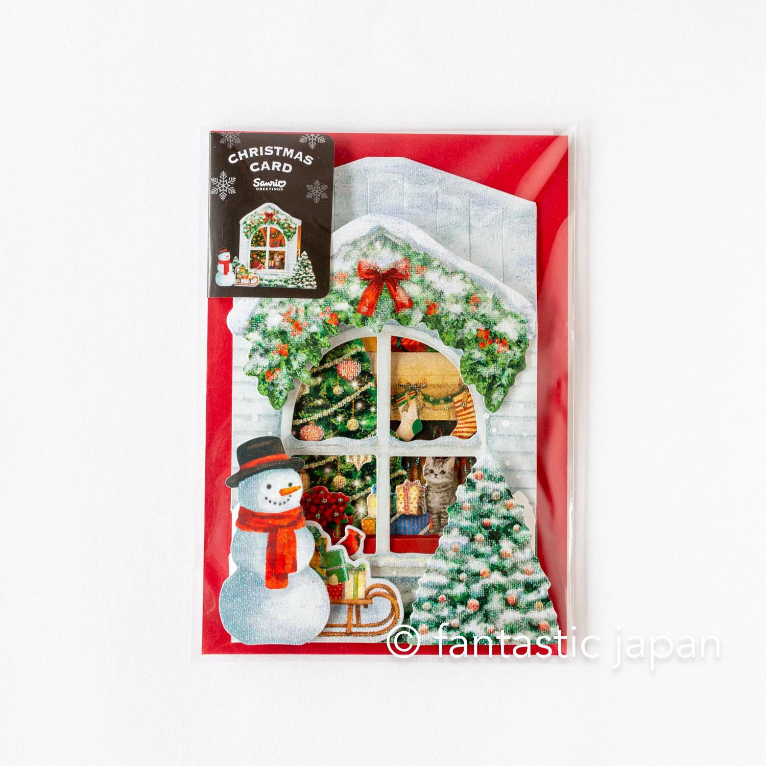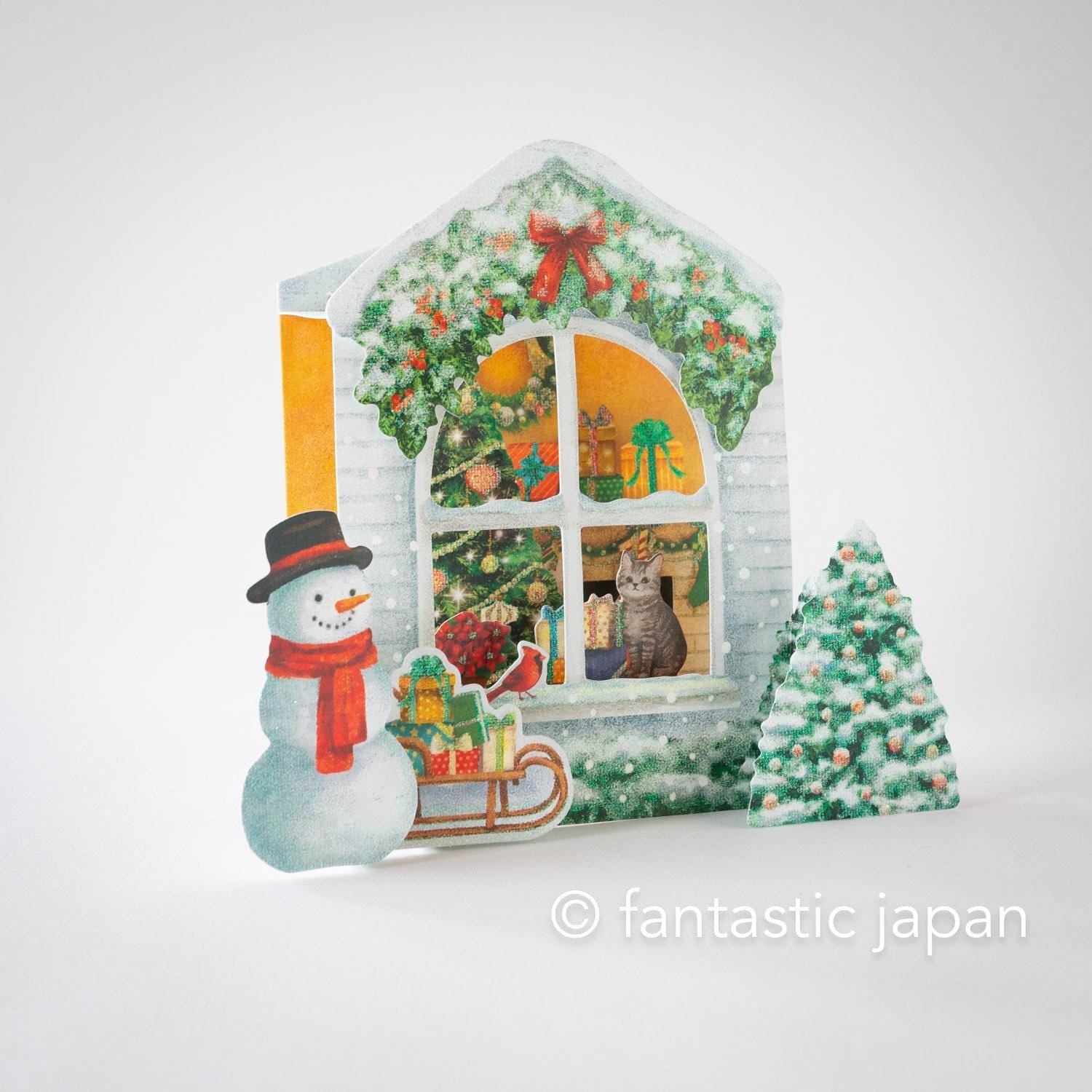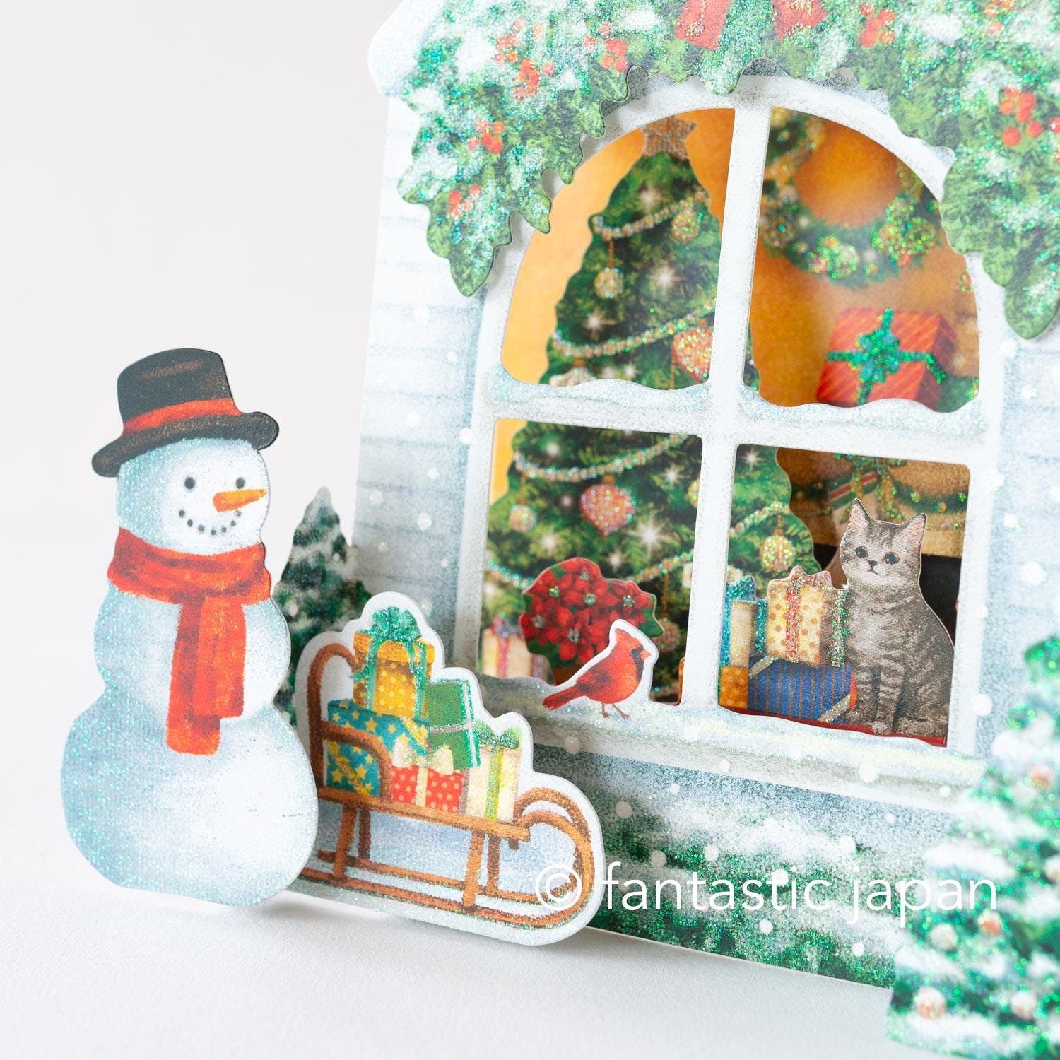 A three-dimensional greeting card featuring a warm indoor scene with a glittering snowy landscape in a rich, layered design. Enjoy the depth created by overlapping elements such as a fireplace, Christmas tree, cat, window frame, and snowman. Glitter finish on the entire surface; can be displayed standing; message space on the back; comes with a red envelope.