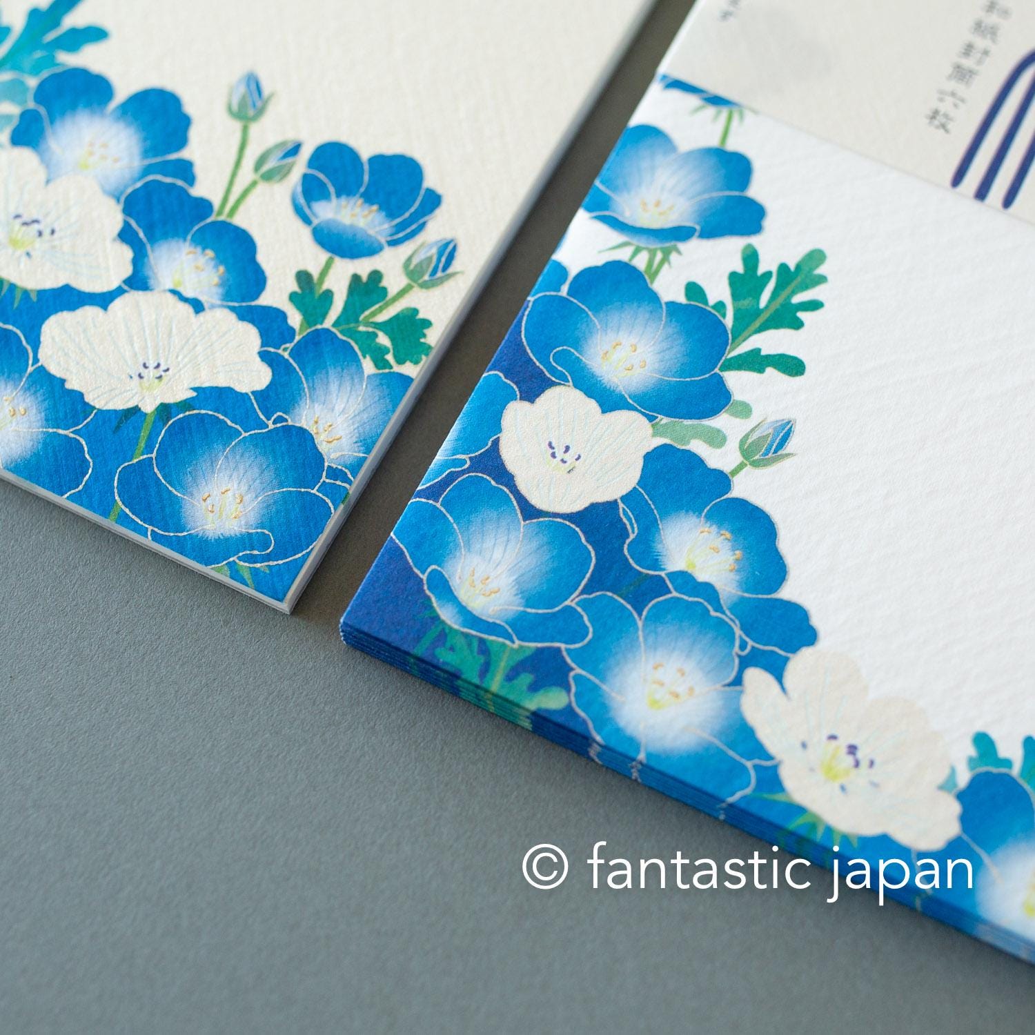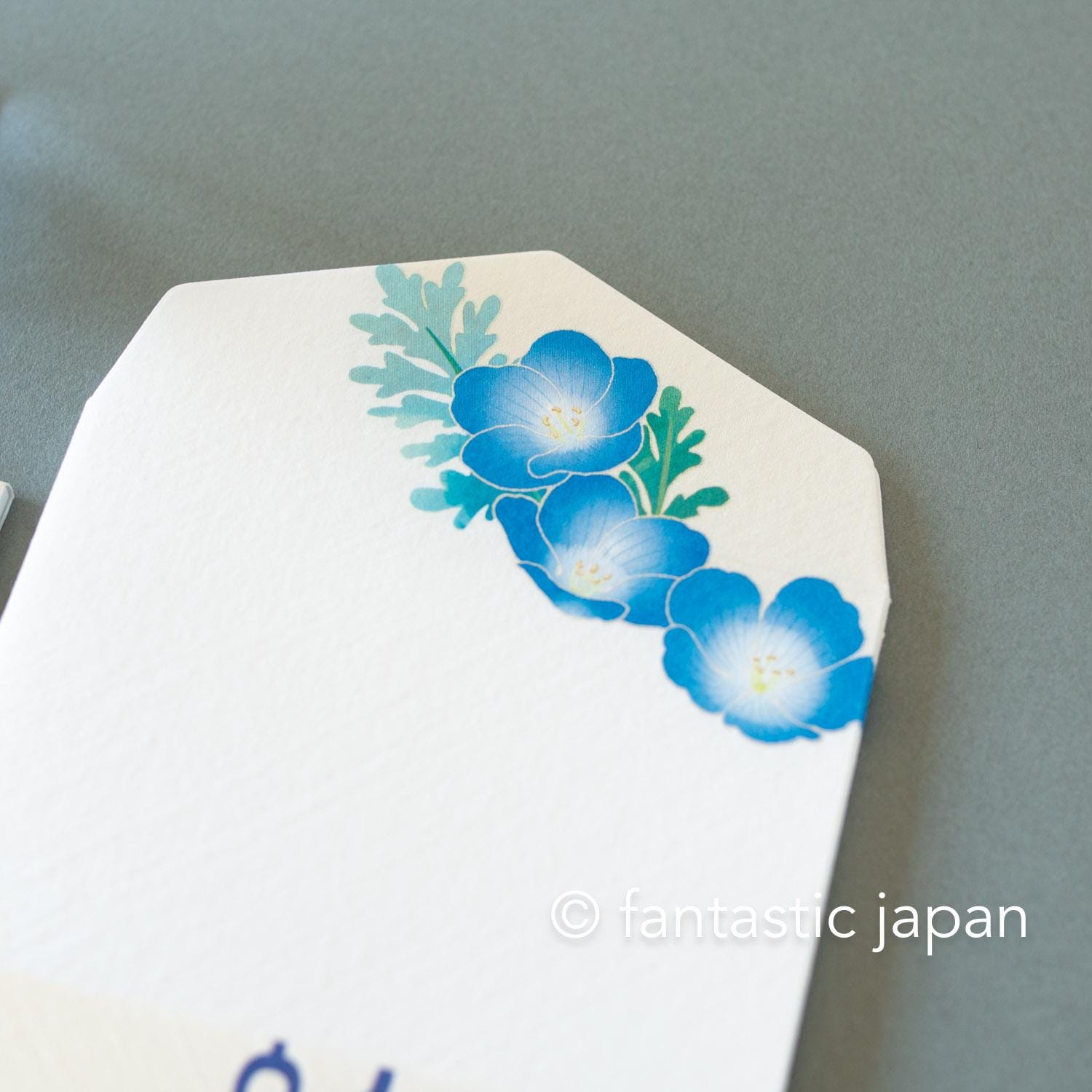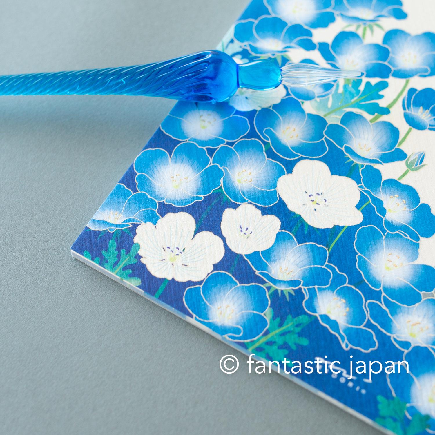 Using Japanese paper, a traditional material that has been used for 1,000 years, these letterheads reflect the colors of spring. A field covered in vibrant blue nemophila flowers, spreading endlessly like a sea of blossoms. The rare white nemophila are expressed using iridescent pearl ink, which changes color depending on the viewing angle and the way the light hits it.