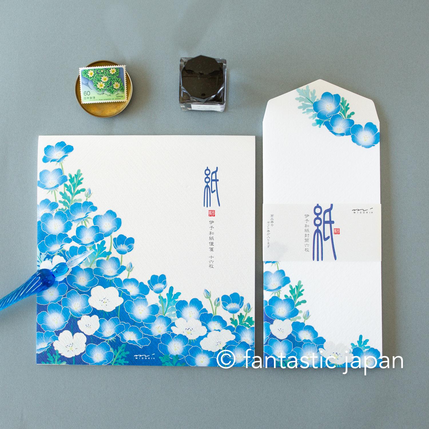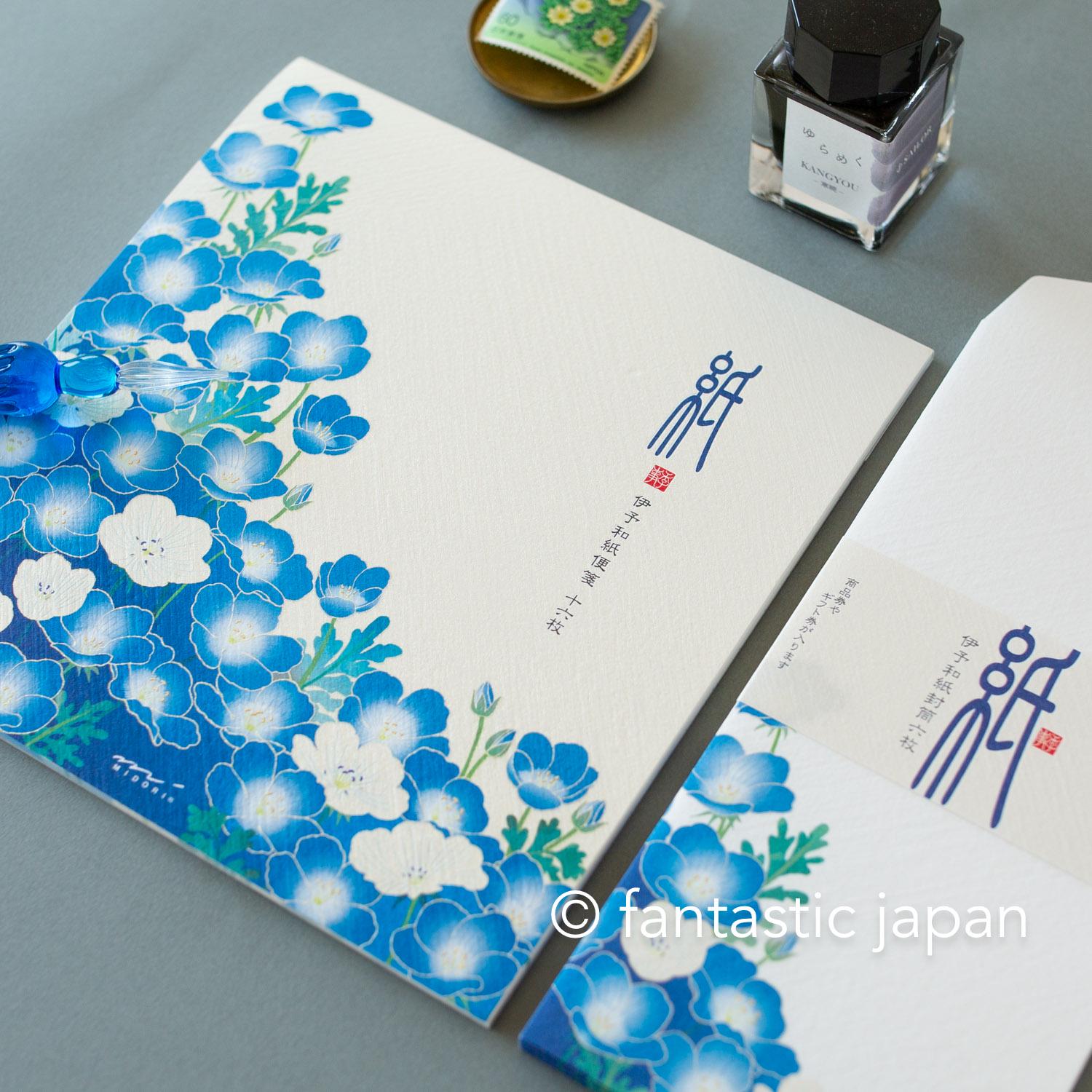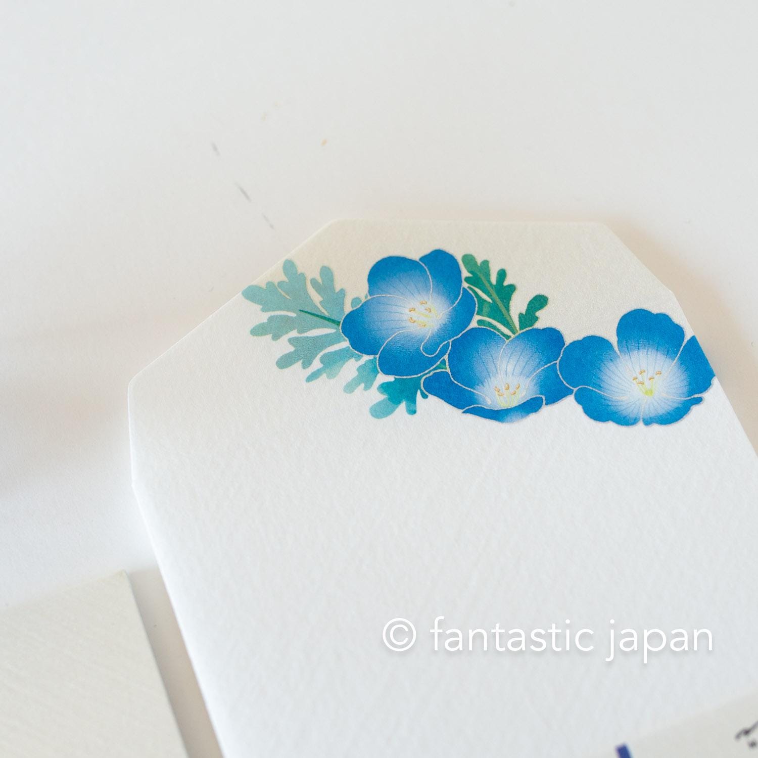 Using Japanese paper, a traditional material that has been used for 1,000 years, these letterheads reflect the colors of spring. A field covered in vibrant blue nemophila flowers, spreading endlessly like a sea of blossoms. The rare white nemophila are expressed using iridescent pearl ink, which changes color depending on the viewing angle and the way the light hits it.