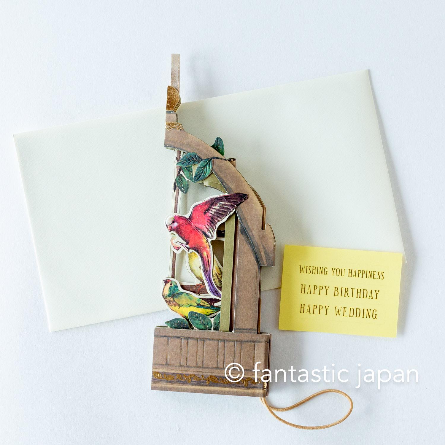 Three types of message stickers ("Wishing you happiness", "happy birthday", "happy wedding") are included in the package and can be attached to the plate on the front of the birdcage according to the purpose of the card. There is a message space on the back of the card.
