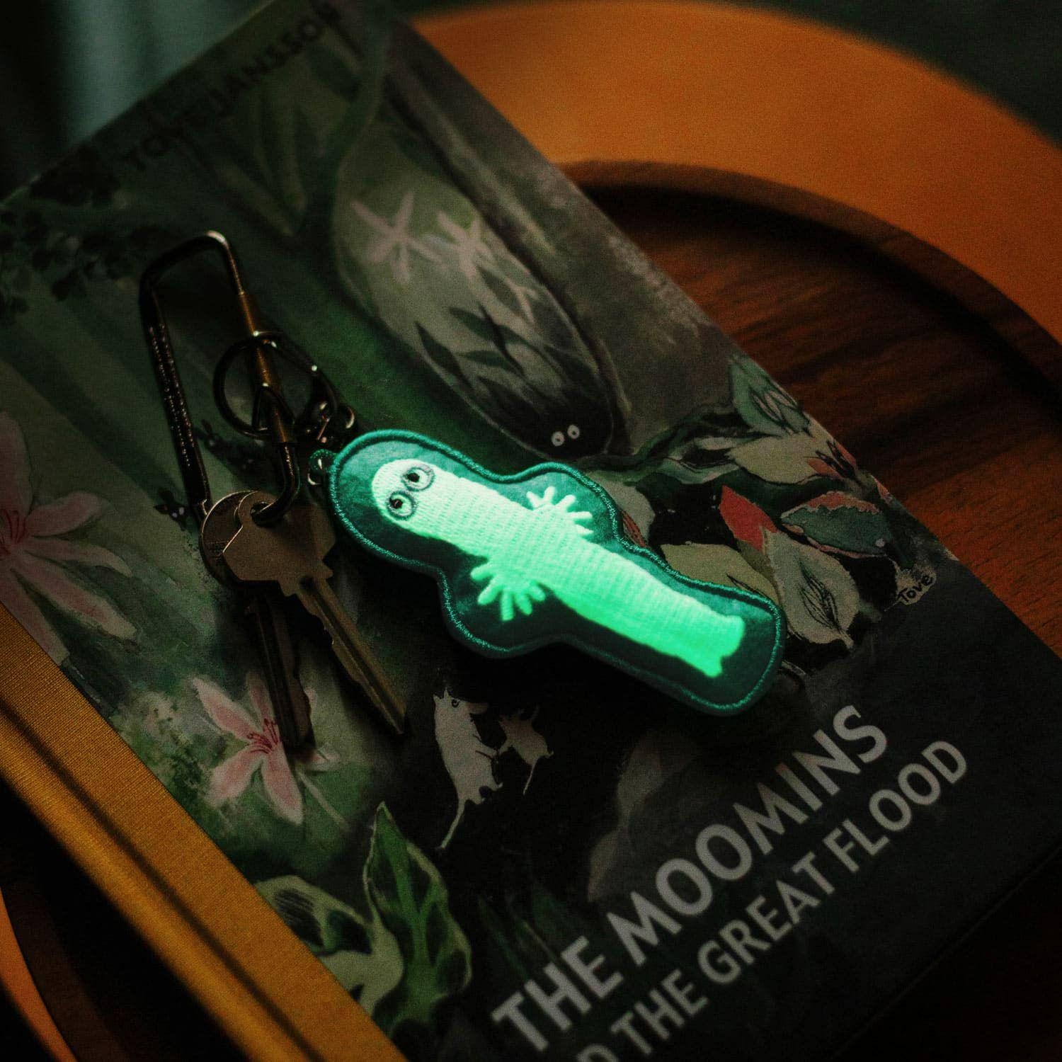 The design captures the image of a charged Hattifattener flickering with a pale blue light in the dark. Its rounded, three-dimensional shape and soft texture make it irresistible to hold.