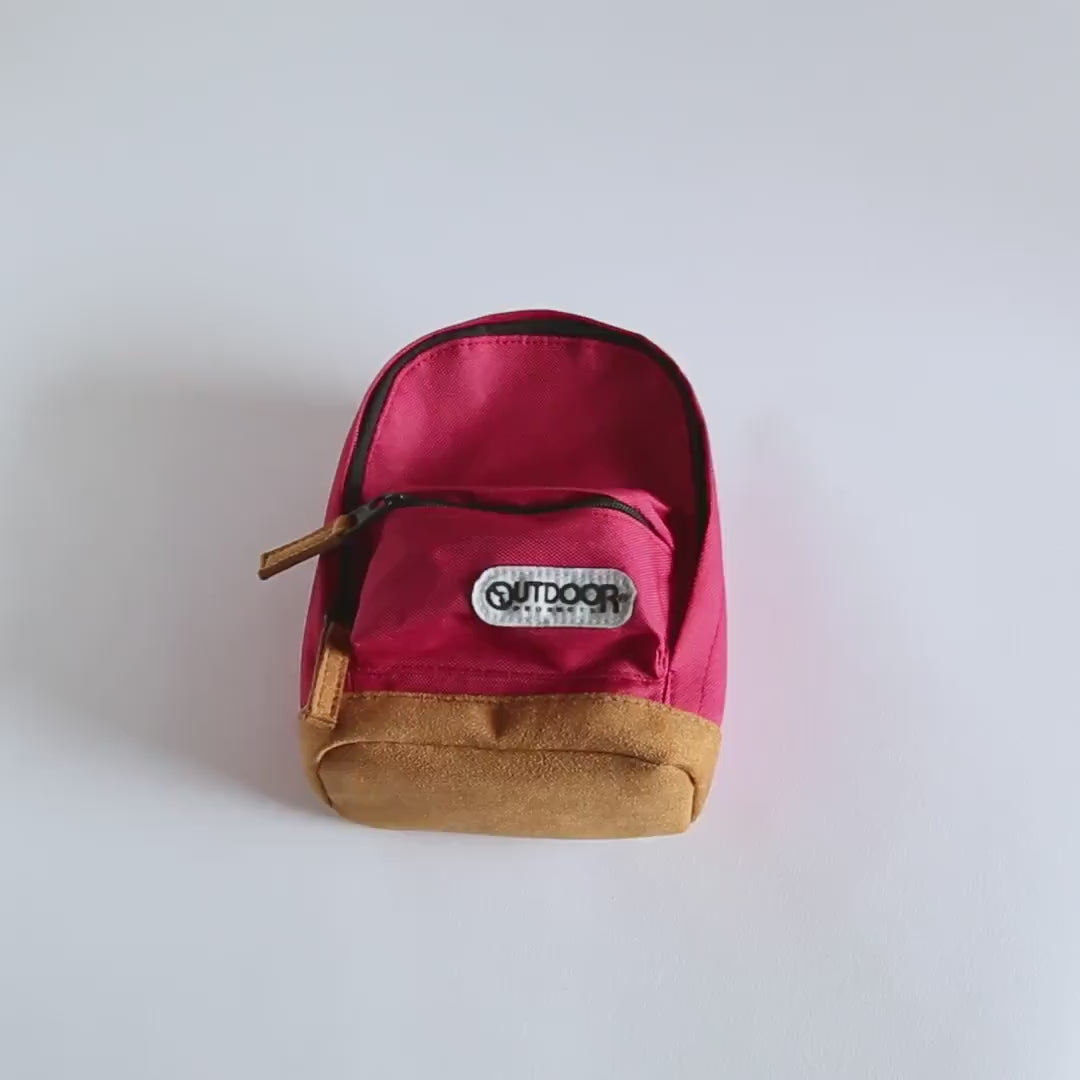 Backpack-style pen case with a front pocket that neatly stores small items such as sticky notes and clips; comes with a carabiner for easy carrying.